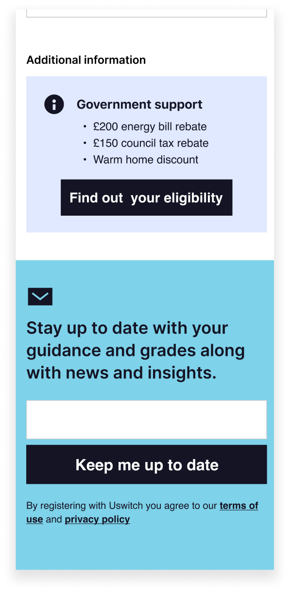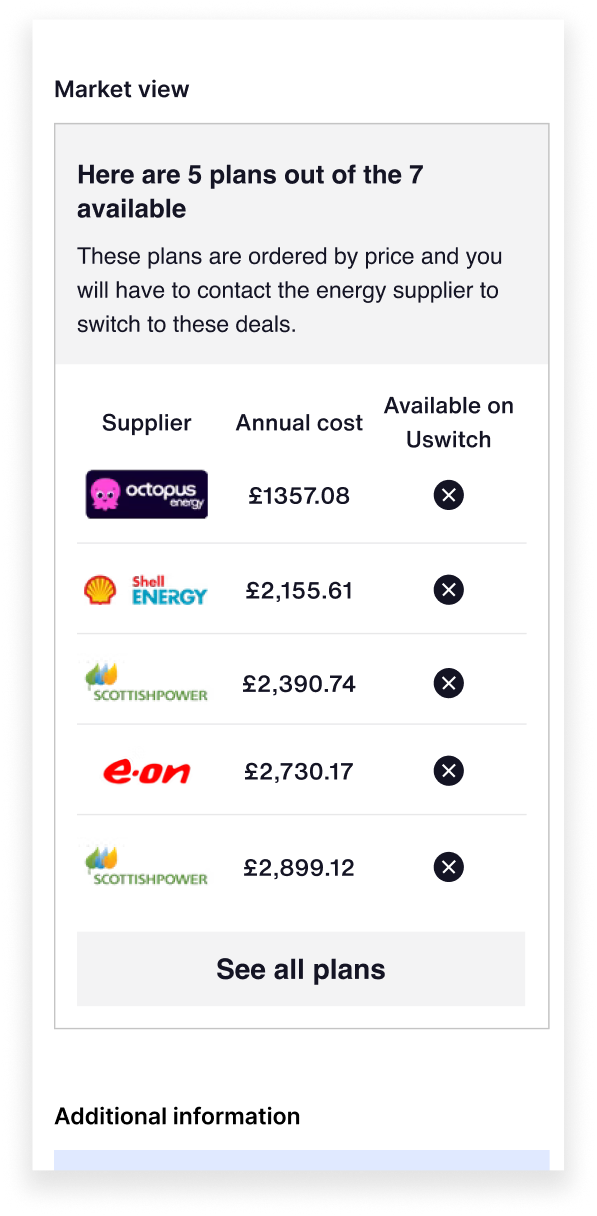 We focused on created giving clear explanations on their situation and a market view of energy plans only available through providers. The result was a product which helped our users navigate the energy crisis and allowed us to keep in contact with them.
