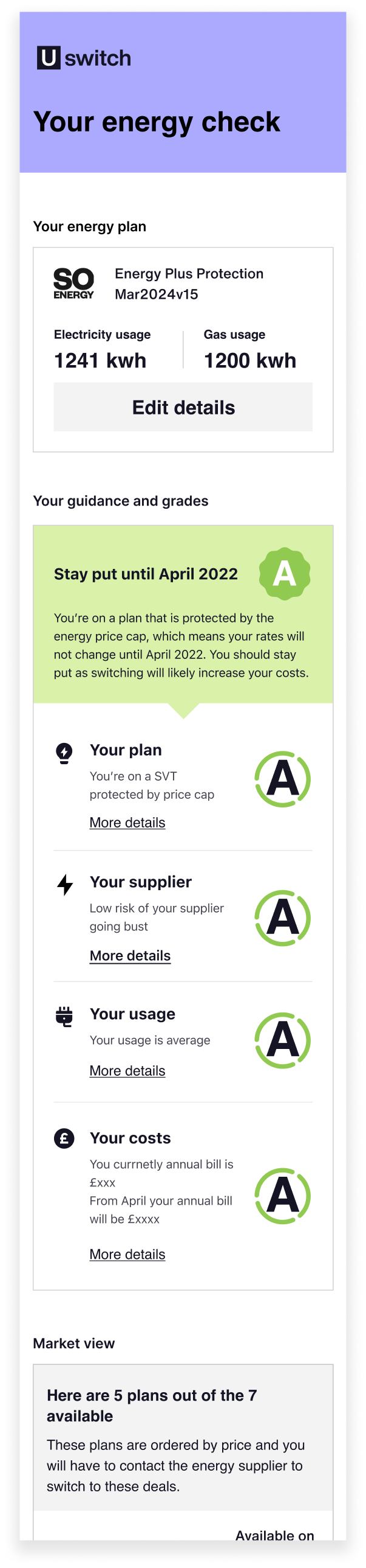 Energy plan switching is Uswitch main product. Since this was no longer possible, the product I worked in had to create a new product in order to help our users through this energy crisis and find a way to stay relevant to them so that when energy plans returned, we would be the comparison site they would use.