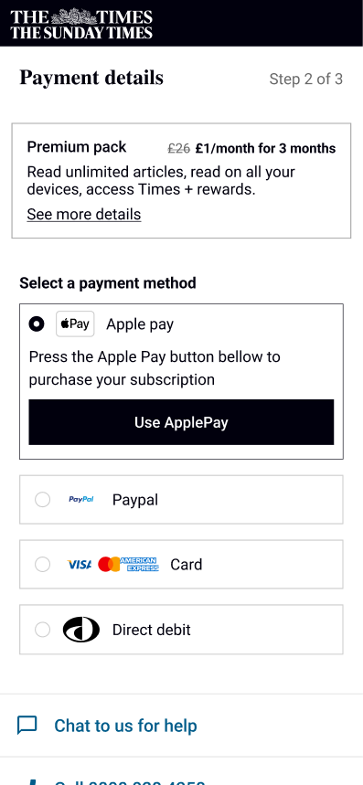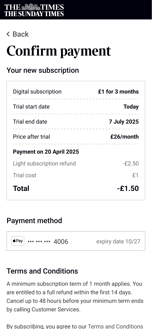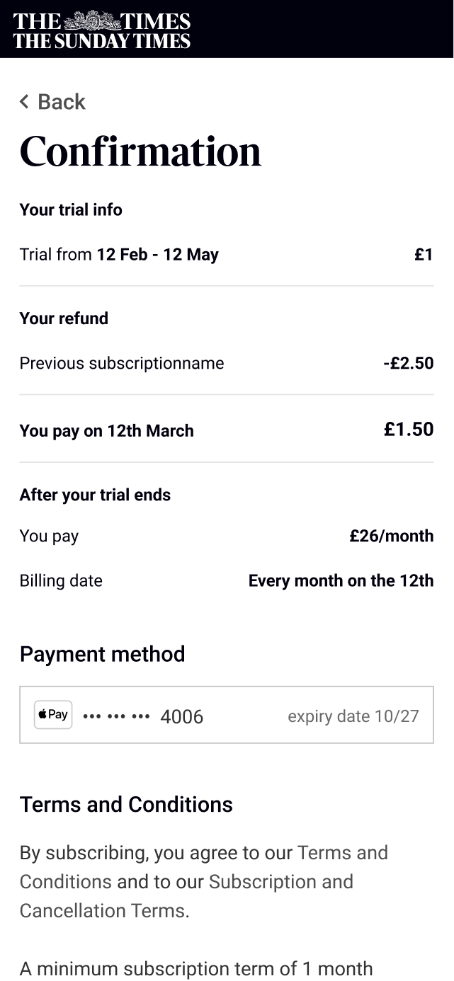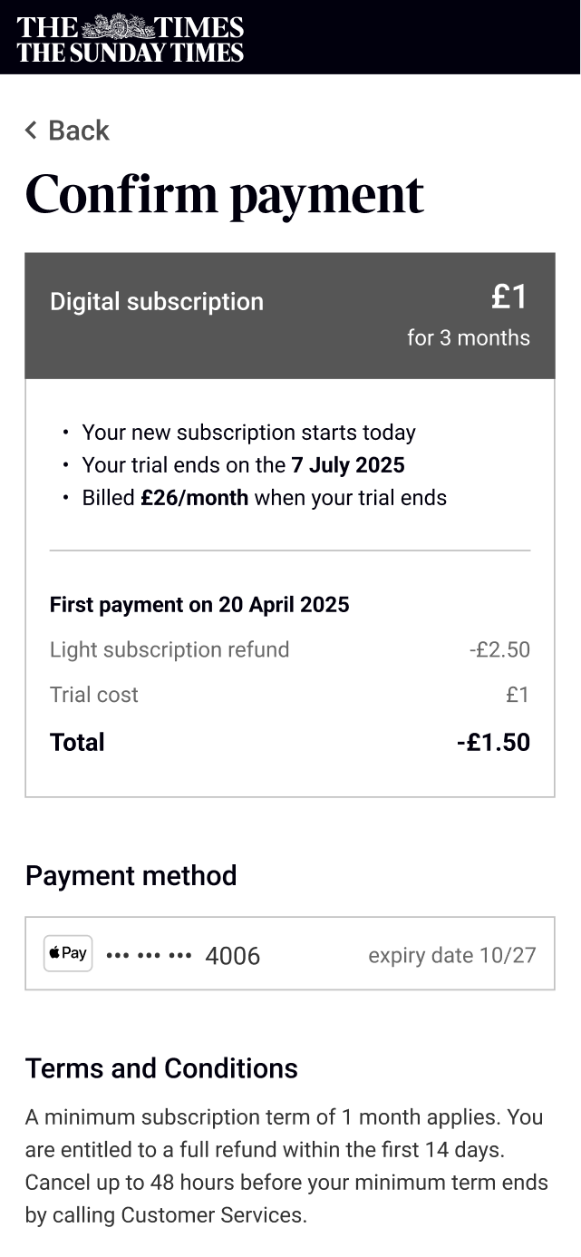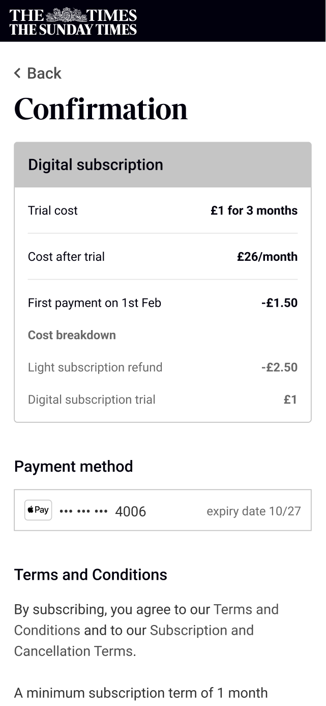 I led the redesign of The Times' subscription architecture and upgrade experience over 4 months, working as the sole product designer responsible for research, UI, and content design. The aim of this project was to allow the marketing team from creating new subscription by rebuilding how features work and create the opportunity to increase revenue by encouraging users to upgrade with an online upgrade journey and gating features.