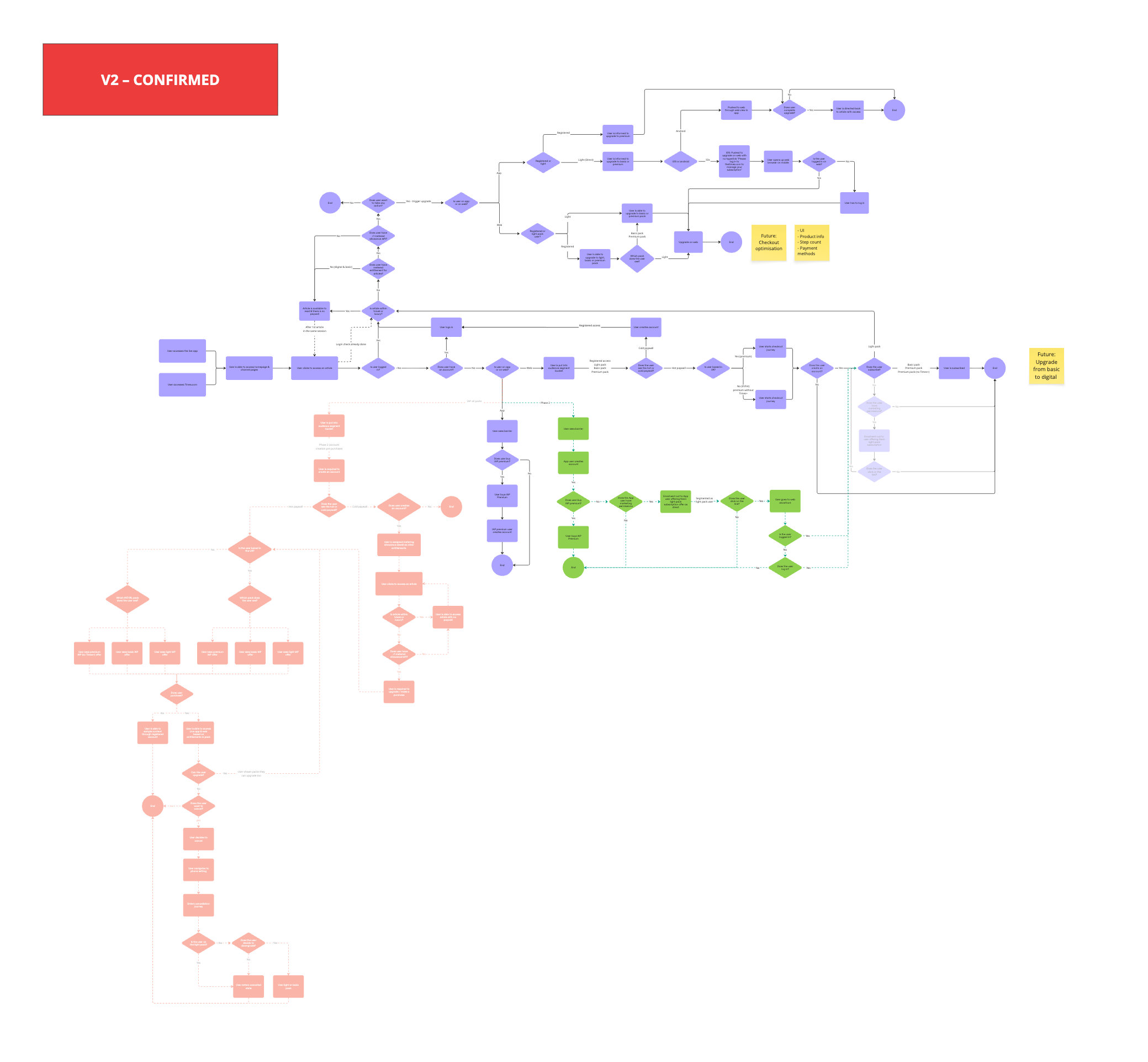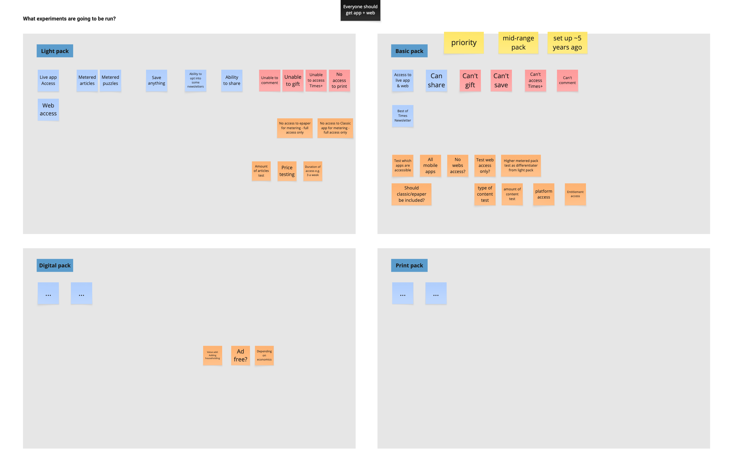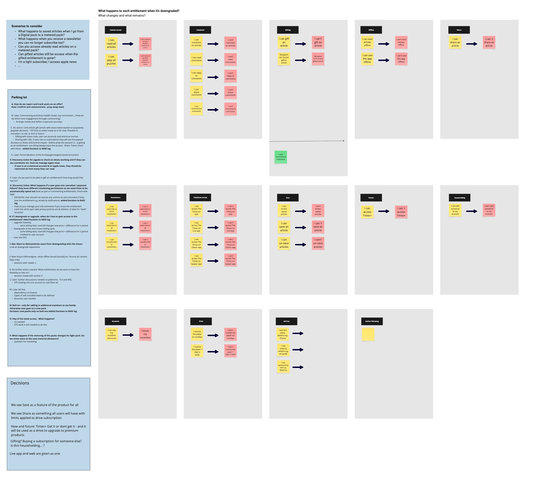 This shift was critical. By breaking down packs into independent features (offline reading, article limits, app access, specific content sections), we could create a flexible system where marketing could combine any features in a subscription. The workshop aligned everyone on the logic for each feature.